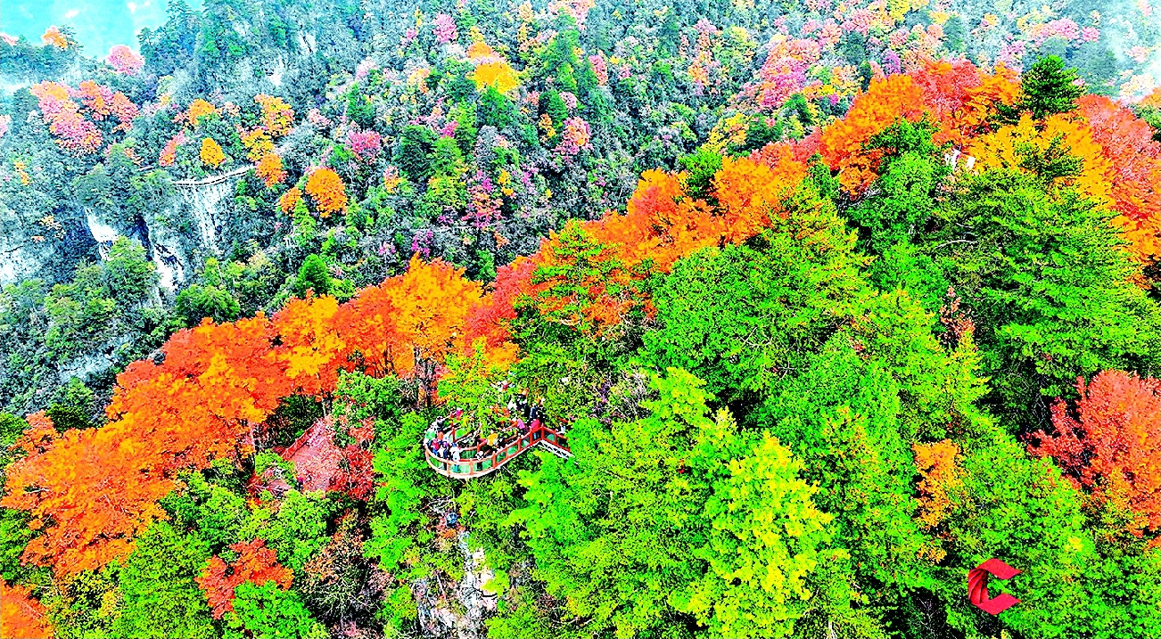 立冬已至,正值观赏红叶的绝佳时期。目前,四川多地红叶已进入最佳观赏期。11月6日,四川省林业和草原局发布第二期红叶观赏指数,巴中光雾山、广元曾家山、广元盐井河峡谷、阿坝毕棚沟、甘孜伍须海、甘孜鲜水河大峡谷等地的指数均已达Ⅲ级。图为11月初,巴中市南江县光雾山燕子岭,游客在观景栈道上欣赏漫山彩林。 张学金摄(据四川在线)