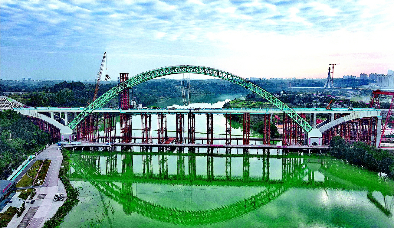 11月10日,在12台600吨连续千斤顶3小时作业后,成渝中线高铁控制性工程沱江特大桥主梁顺利合龙,实现全桥合龙,为成渝中线高铁建设顺利推进打下坚实基础。预计2027年底,成渝中线高铁将建成通车,最高运营时速有望达到400公里,将成为全球最快高铁,届时从成都至重庆将实现50分钟通达。图为建设现场。 记者雷琰/文 受访单位供图