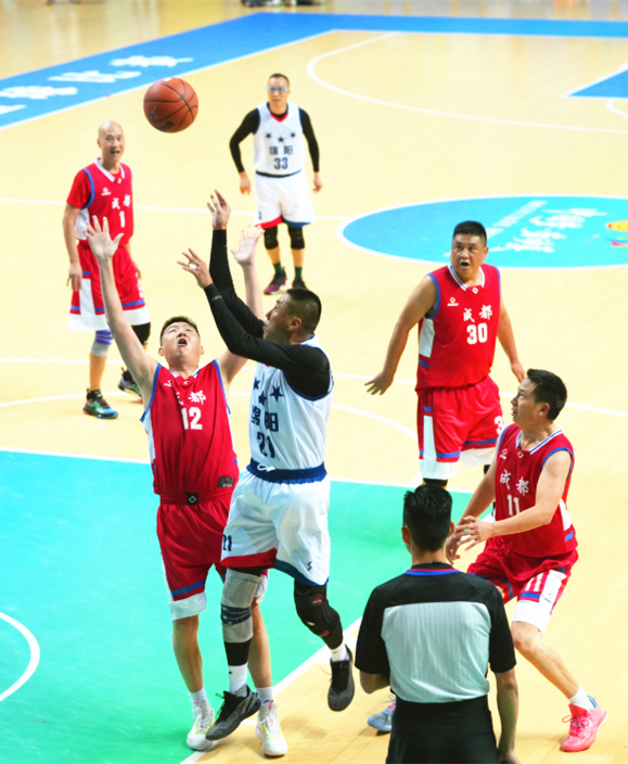成都队与绵阳队争抢篮板球
