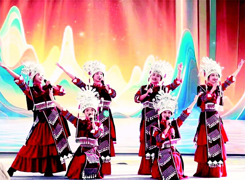 当充满苗族元素和风格的旋律响起时,现场又掀起了一轮高潮。“公路修到家门前,苗家新居人心暖,致富路上迈大步,苗山处处是春天。”叙永县总工会原创歌曲《梦想花开照苗山》,主要描述苗族同胞在党和政府的关心、领导下,携手共进、脱贫致富,过上美满幸福生活。“梦想花开不是一朵,是满山满坡的春”,观众透过写实的歌词仿佛看到了苗山的故事正在继续,还有更多“咪彩(女孩)”在为家乡的未来奋斗着。