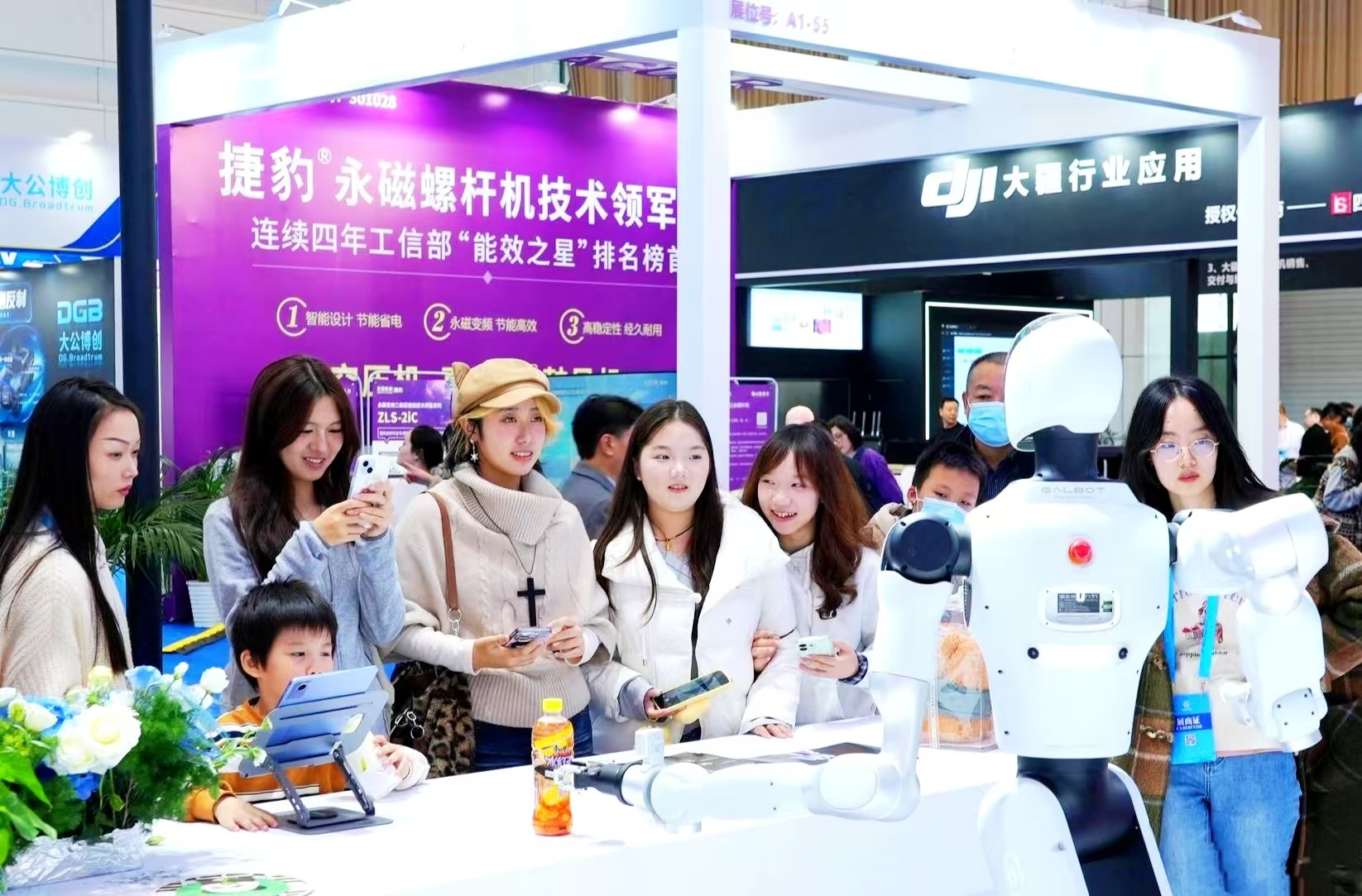“动力电池为机器人的能量来源,像这款自动售卖机器人Galbot G1满电状态可以正常活动4至5小时。”北京银河通用机器人有限公司工作人员介绍。据了解,本次动力电池应用生态展览会总面积达5万平方米,参展商覆盖动力电池全产业链上下游企业超200家,展会时间将持续至11月15日。图为机器人为现场观众演示拿取饮料。 周宝摄(据四川在线)