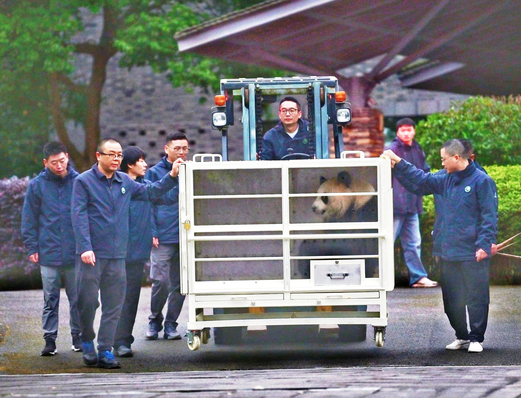 它们于18日早上从中国大熊猫保护研究中心都江堰基地出发,按照协议约定,两只大熊猫将在马来西亚国家动物园旅居10年。图为大熊猫“晓月”转运出发。