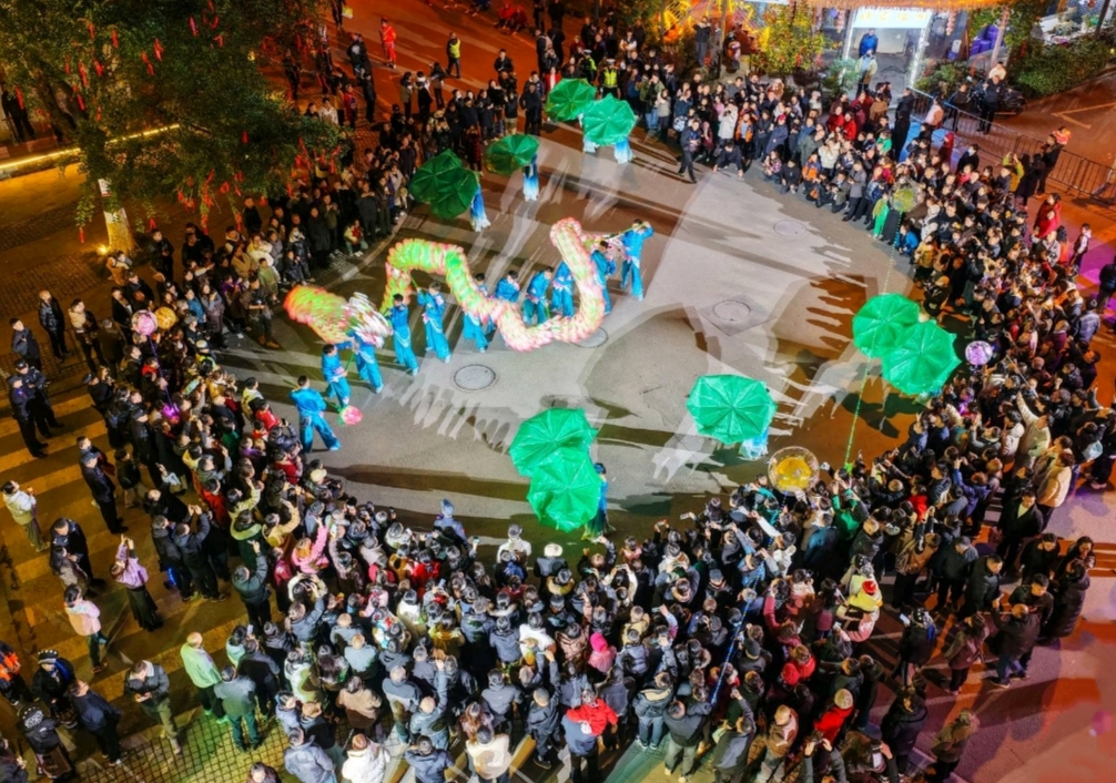 图为11月18日,在阿坝州汶川县映秀镇街头,当地群众纷纷走出家门观看表演和夜景,庆祝羌历新年的到来,现场热闹非凡。 李向雨摄(据四川在线)