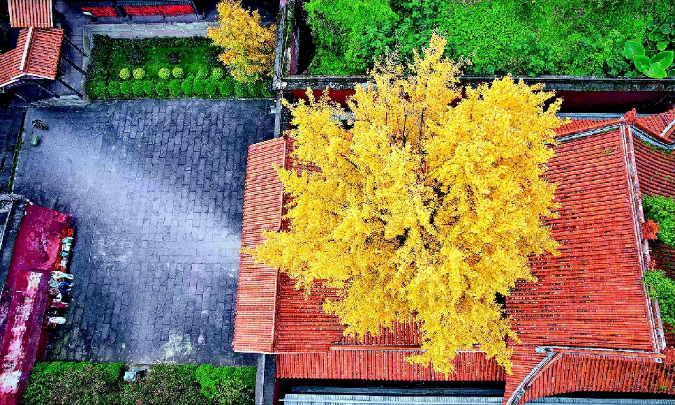 初冬时节,内江市资中文庙内,一株130余年树龄的银杏身披“金甲”,从橙黄的屋顶上探出头来,似在展示自己浓密的枝叶和炫目的色彩,吸引了不少市民游客前来观赏“打卡”。图为11月30日,用无人机航拍的古银杏树。唐明润摄