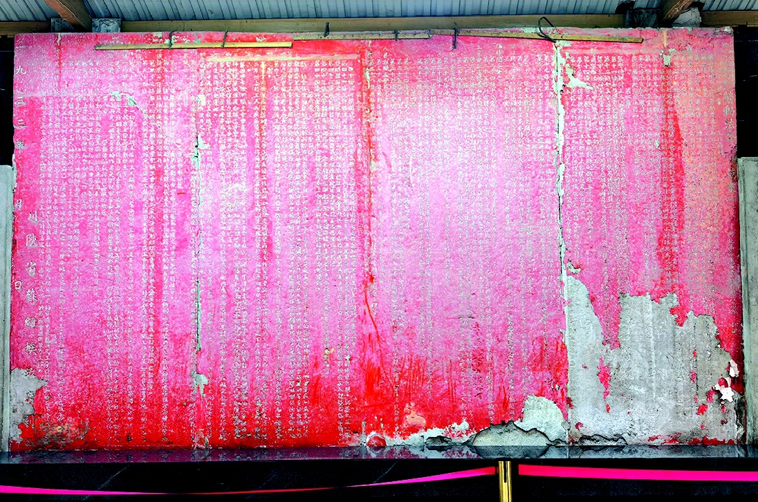 记者走近细看,这座“镇馆之宝”由四块青石板组成,高2.56米,宽4.32米,是整个陈列园中文字最多、字幅最长的石刻文献。石刻通体覆着红色涂层,白色字迹在红色底衬上分外醒目。石刻右侧“劳动法令(草案)”几个大字雄浑有力,大字左侧密密麻麻地镌刻着八章六十三条、约6000字的法令全文。