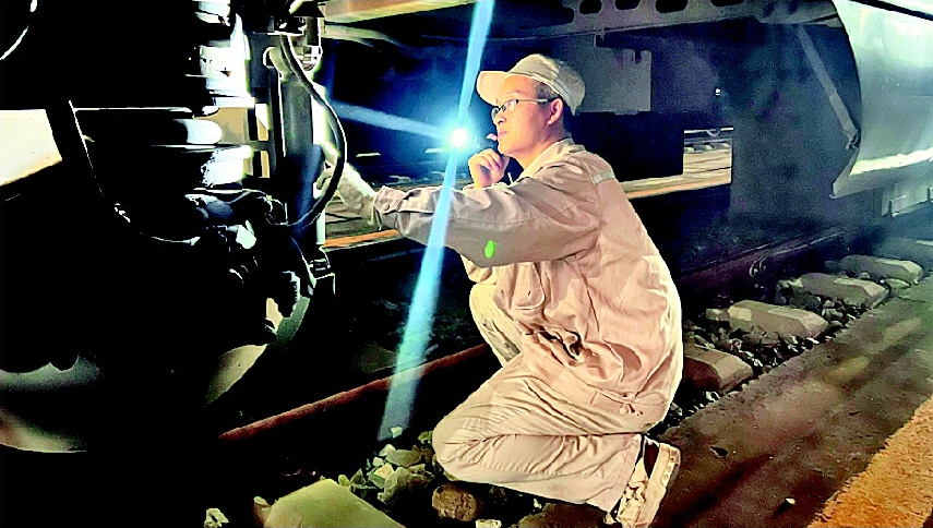 40多岁的杨小军因常年熬夜检车,额头上的抬头纹都比同龄人要深些,眼尾的纹路也像是被风刻出来的,大家都称呼他为“老杨”。老杨的手背有些粗糙,指关节有些肿大,虎口处还有几道浅浅的疤痕,那都是过去作业时被工具蹭到、被金属边划到留下的。但是,只要老杨一拿起工具,他的手就稳得很,拧螺栓时的力道分毫不差,看电气数据时的眼神也更加犀利。