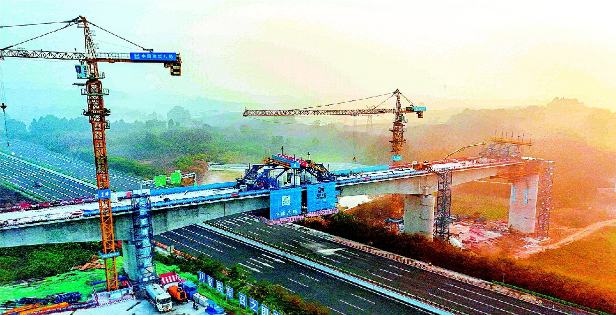 12月10日,由蜀道铁路投资集团主导投资的绵遂资内铁路牌坊湾特大桥跨汉蓉高速公路连续梁顺利合龙。这是项目全线第一个合龙的跨高速公路连续梁,标志着项目桥梁施工取得关键性突破,为后续工程推进奠定坚实基础。