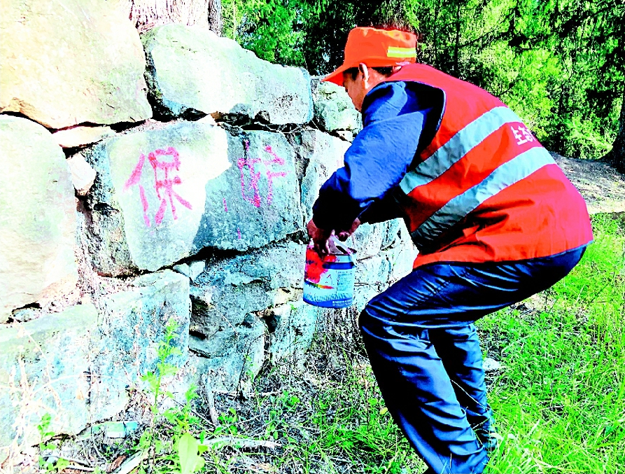 张玉富不好意思地笑笑:“我的字写得不好,还得多练。”这样的“宣传标语”在他巡护的路上并不少见---只要见到平坦的石壁,他总会认真写上几句。这个习惯,从他成为护林员那天起,就一直保持着。