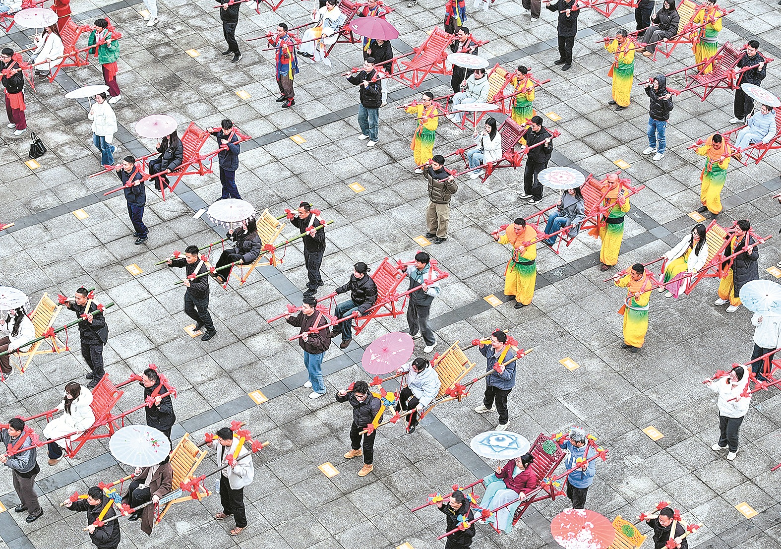 新年临近,华蓥市市民忙着排练非遗“华蓥山滑竿抬幺妹”,为即将到来的元旦和新年巡演做准备。