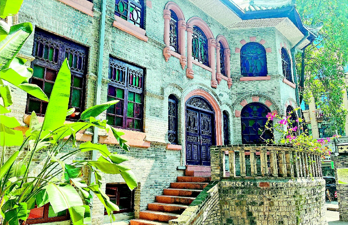 推开虚掩的木门,吱呀声划破巷陌的宁静,也撕开了时光的帷幕。宅楼青灰色砖墙、红色窗框、上翘屋檐与彩色玻璃、圆拱形门窗中西合璧、相得益彰,两楼一底的格局紧凑而不失雅致。