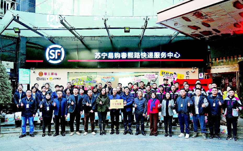 本报讯(锦工文/图)12月25日上午,由四川顺丰速运与苏宁易购联合打造的快递服务站点暨工会驿站,在锦江区苏宁易购春熙路店正式投用。该站点是在成都市、锦江区两级工会和锦江区春熙路街道办事处的指导与大力支持下,顺丰集团工会与苏宁易购集团工会通过企业工会共建,整合资源、优势互补,创新打造的全国首个“共建共享工会驿站+快递服务中心”。