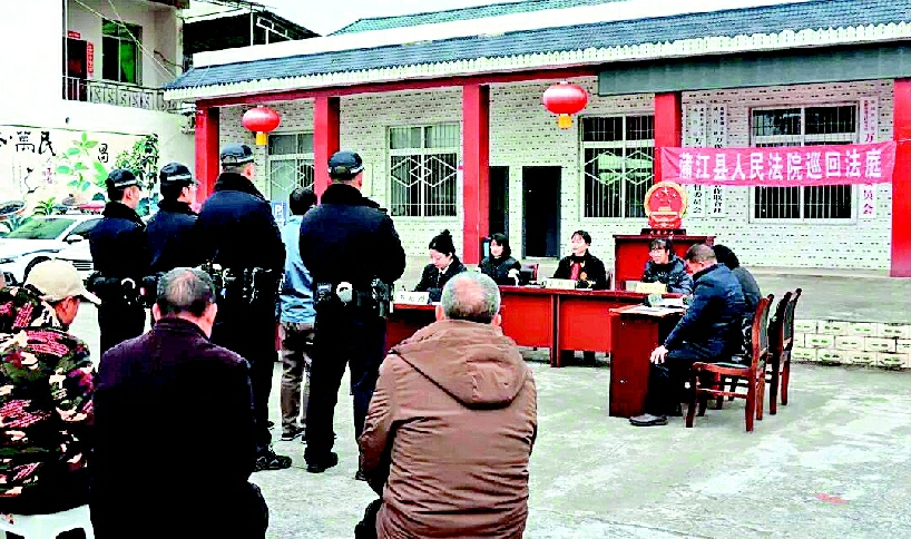 午后的阳光透过树梢,洒在蒲江县万民村社区的小广场上。国徽高悬,法槌在案,12月25日,成都市蒲江县法院将巡回法庭搬进社区,公开开庭审理一起危害国家重点保护植物罪刑事附带民事公益诉讼案件,30名群众现场旁听庭审。