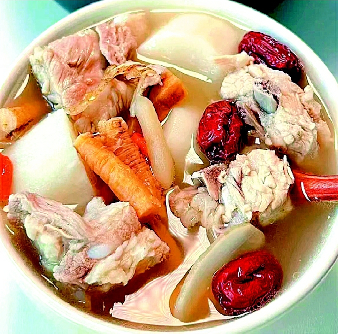 做法:1.黄芪、党参、麦冬、玉竹洗净泡1小时。2.排骨洗净放葱、姜、料酒焯水后,将浸泡好的食材连汤汁一起倒入,加清水中火慢炖20分钟。3.加山药、红枣、枸杞小火慢炖15分钟,放盐、味精出锅。