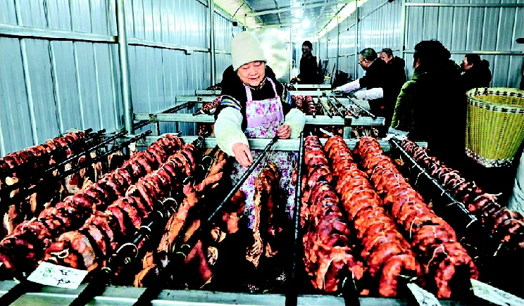 在熏制现场,居民们在工作人员引导下,正有序进行挂肉、登记、取号等流程,操作区划分清晰,专业熏制设备运转有序。