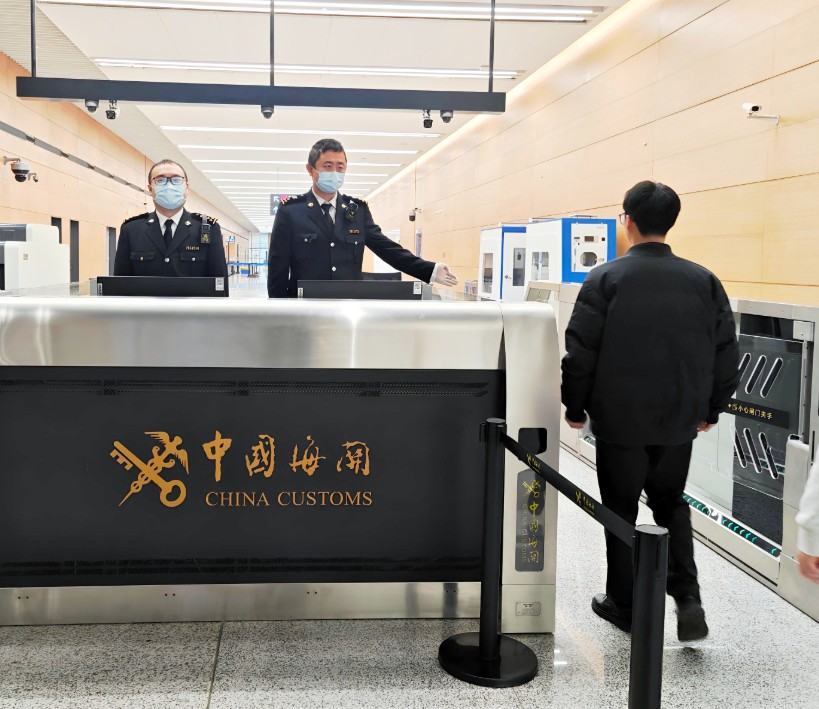 1月9日,在天府国际机场,海关关员正在监管HU782通程航班中转旅客 成都海关供图
