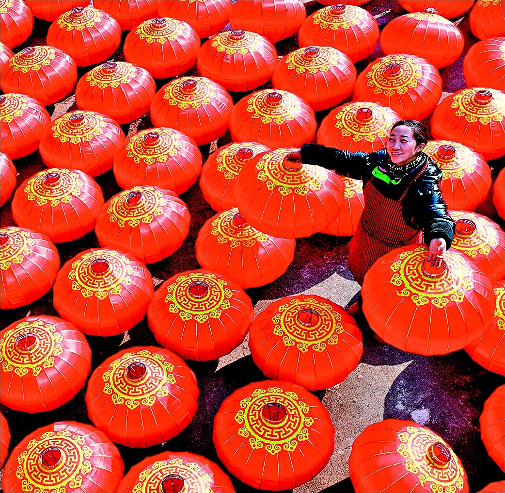图为1月8日,德阳市绵竹市紫岩街道双坪村的灯笼工坊内,返乡创业青年张显琼正在晾晒灯笼。 王平摄(四川在线发)