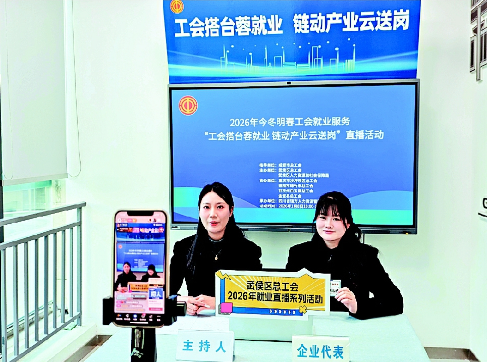 本报讯(记者张杨文/图)1月8日,一场打破时空限制、多方协同联动的云端招聘活动在线上火热开展。由成都市总工会指导,武侯区总工会、区人力资源和社会保障局主办,重庆市沙坪坝区总工会、德阳绵竹市总工会、甘孜州白玉县总工会、金堂县总工会协办,四川省瑞方人力资源管理有限公司承办的“2026年今冬明春工会就业服务‘工会搭台蓉就业链动产业云送岗’直播活动”如期开展。