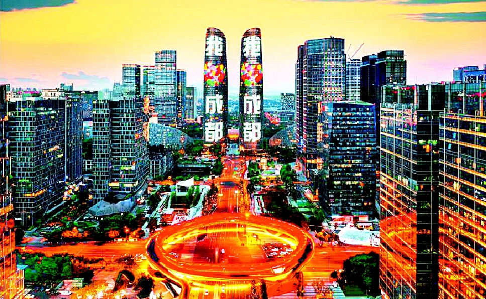 摄影作品《天府双塔夜景航拍》 张博摄