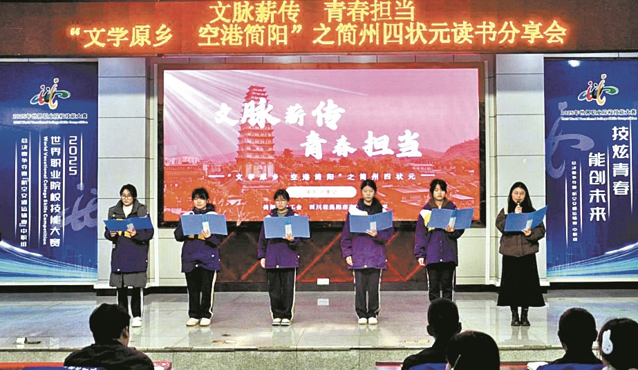 “洞庭青草,近中秋,更无一点风色。玉鉴琼田三万顷,着我扁舟一叶……”1月19日下午,简阳市高级职业中学的礼堂内,书声琅琅。300多名师生,在简阳市总工会与学校联合打造的“文学原乡空港简阳”读书分享会上,完成了一场与四位“简州状元”的跨时空对话。