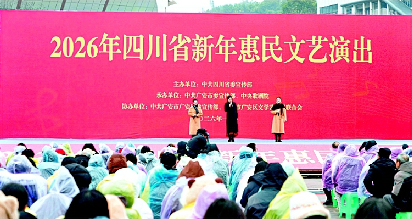 据四川新闻网消息(游伍琼文/图)1月25日上午9时30分,一曲《春风十万里》的旋律在广安市广安区市民广场响起,拉开了2026年四川省新年惠民文艺演出广安站的帷幕。