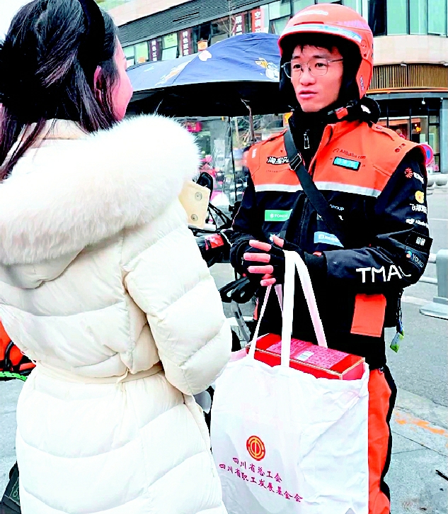 1月22日,成都银泰城广场上温情流动,“川工妹儿”代表四川省总工会、省职工发展基金会,在此等候着一位特殊的外卖骑手---唐琪。刚跑完一单配送、工装上还带着风尘与寒意的他,特意抽空赴约。