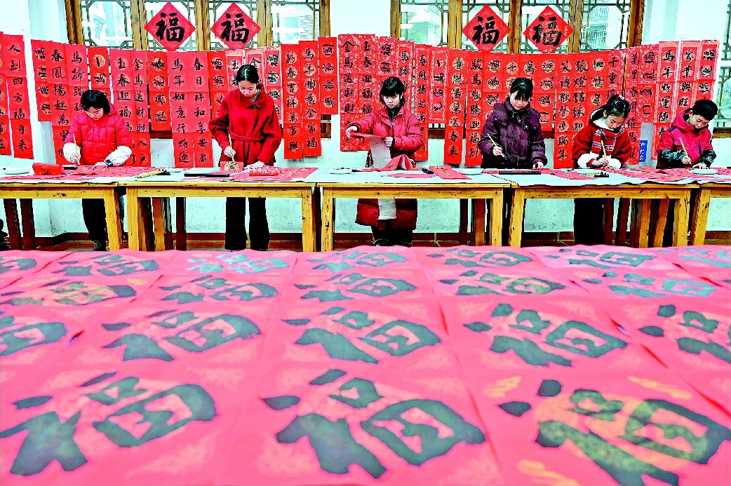 图为1月29日,在内江市东兴区东兴老街,小学生们正在为社区居民书写春联和“福”字。 兰自涛摄