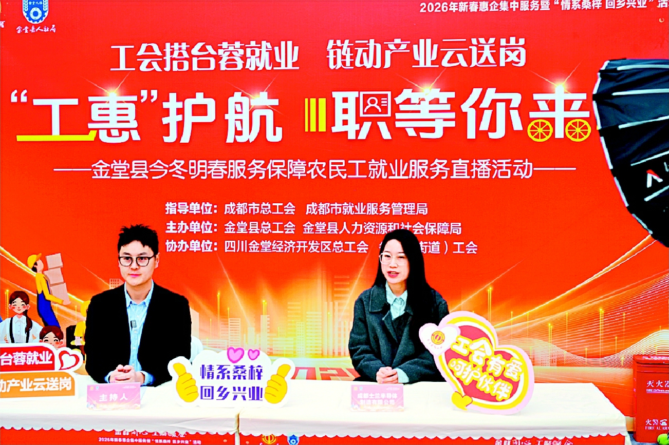 活动现场暖意持续升温,外场八大专区热闹非凡,服务热潮持续涌动。“我在外打工多年,今年想回乡就业,刚好看到直播带岗,岗位很对胃口。”在“劳模领航”招工就业区,返乡务工者张师傅一边仔细咨询岗位详情,一边熟练扫码填写求职信息。记者在现场看到,这里线下招聘与直播带岗同步进行,既为求职者牵线搭桥,也同步推介金堂本地产业政策,实现“就业+宣策”双向发力。