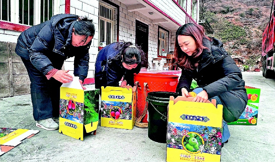 郑秋苹(左一)正在麻利地整理装箱的苹果