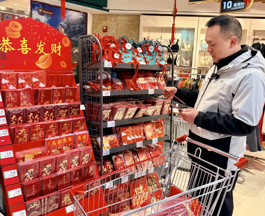 超市里,红彤彤的新年吊旗整齐垂挂,烫金的“福”字和春联铺满货架,欢乐的贺年歌曲在耳边回荡,浓浓的年味扑面而来。“这里东西全,一趟就能买齐,方便!”张爽推着购物车,笑着对身旁的母亲说。