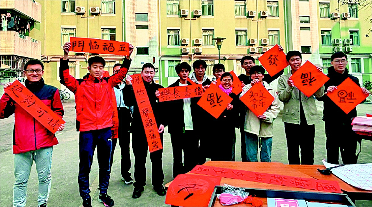 杨琼(右五)和同学们一起写对联、“福”字,共贺新春