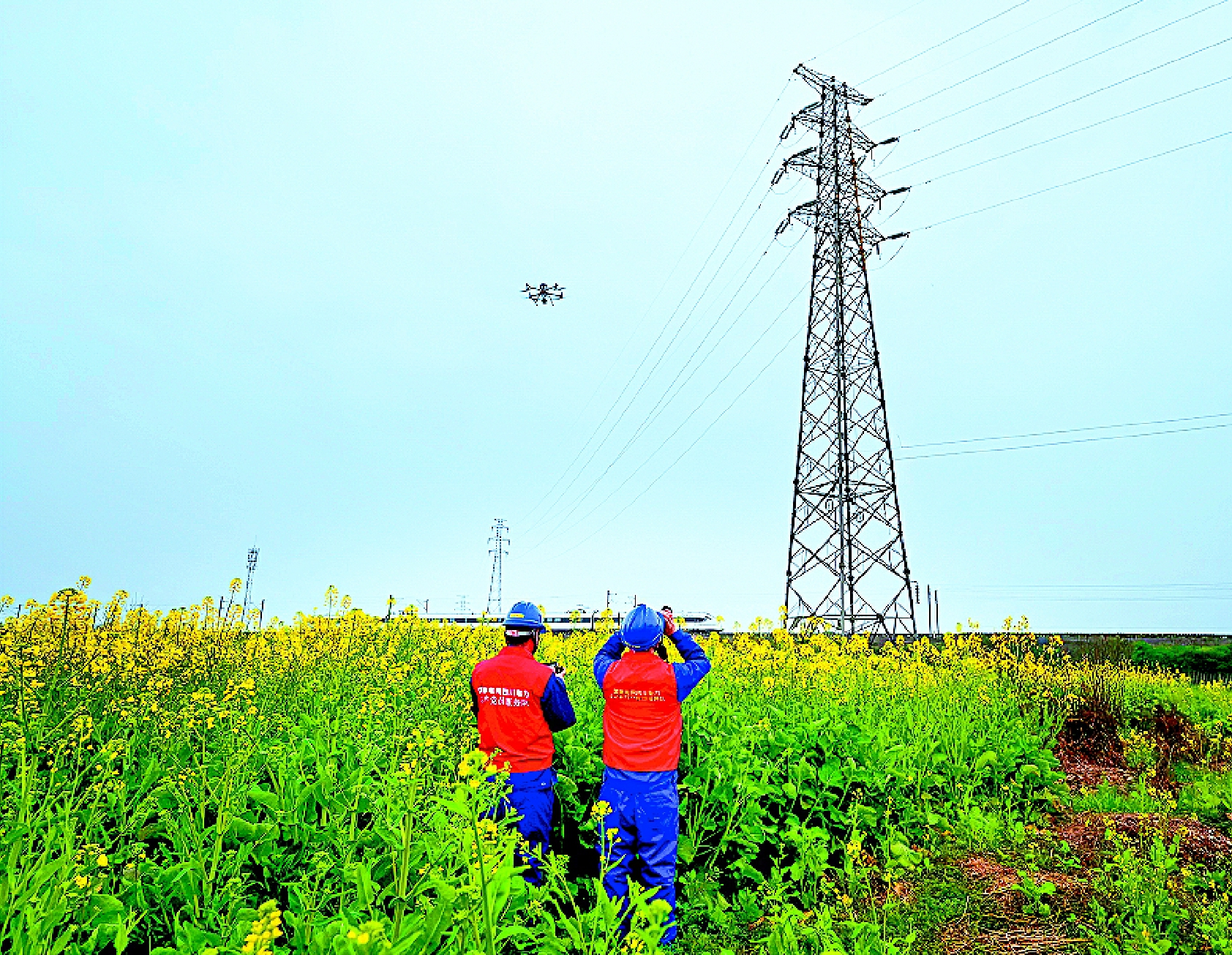 工作人员对110千伏隆王线、隆昌线跨成雅高铁路段进行无人机巡检 刘通摄