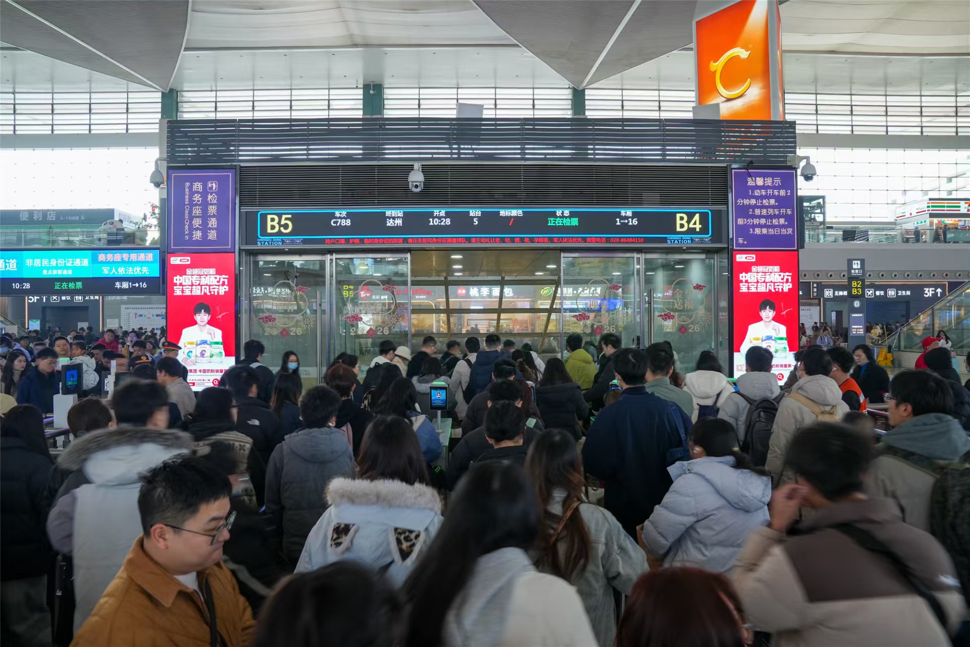 “G1702次,准备开始检票,高架、站台做好准备。”2月24日9时,成都东站候车大厅内人头攒动,每小时进站客流高达3万人次。百米之外的综控室内,却是另一番紧张有序的景象,这里是成都东站高效运转的“神经中枢”,值班主任胡亚萱紧盯着眼前的96块监控屏,列车动态、客流热力、设备状态尽收眼底。键盘敲击声、对讲机指令声,编织成一张精密高效的调度网。