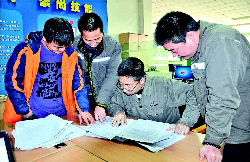 江勇(右二)同技师们交流探讨