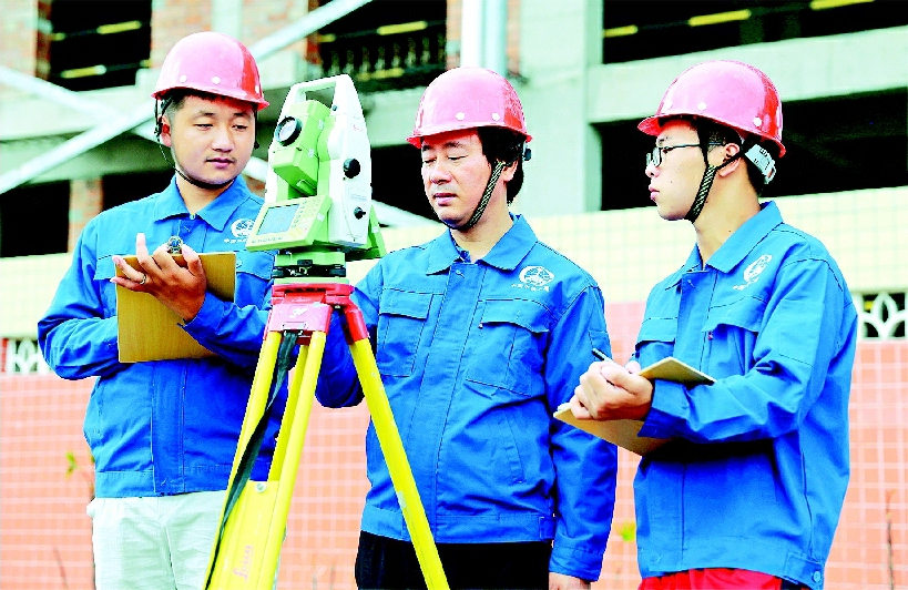 郭平(中)指导同事开展测量工作