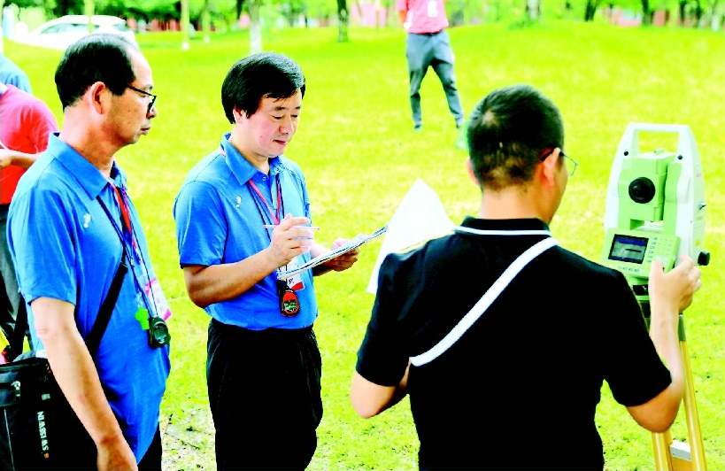 郭平(中)担任测量技能大赛裁判