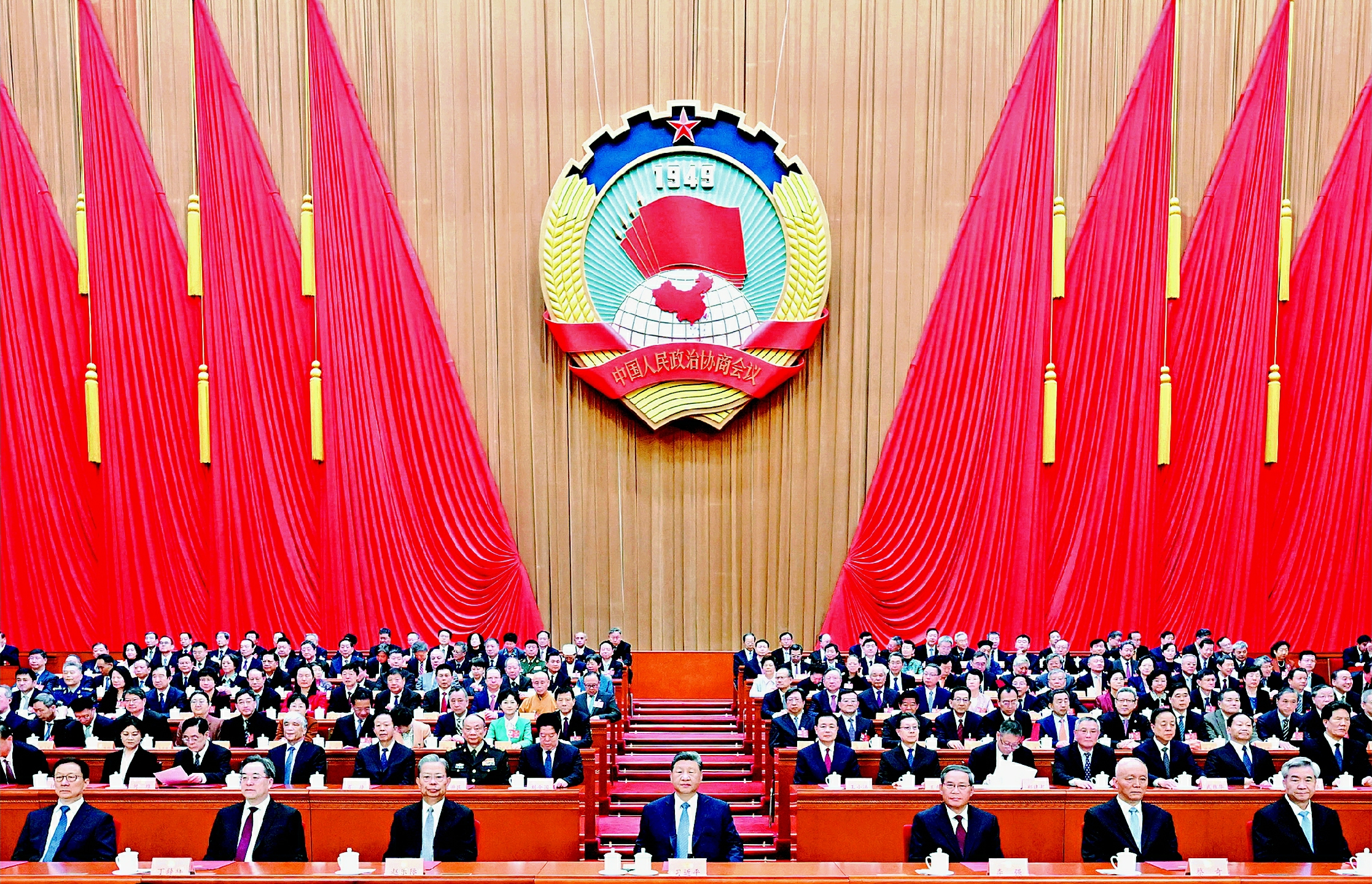 3月11日上午,中国人民政治协商会议第十四届全国委员会第四次会议在北京人民大会堂闭幕。这是习近平、李强、赵乐际、蔡奇、丁薛祥、李希、韩正在主席台就座。 新华社记者燕雁摄