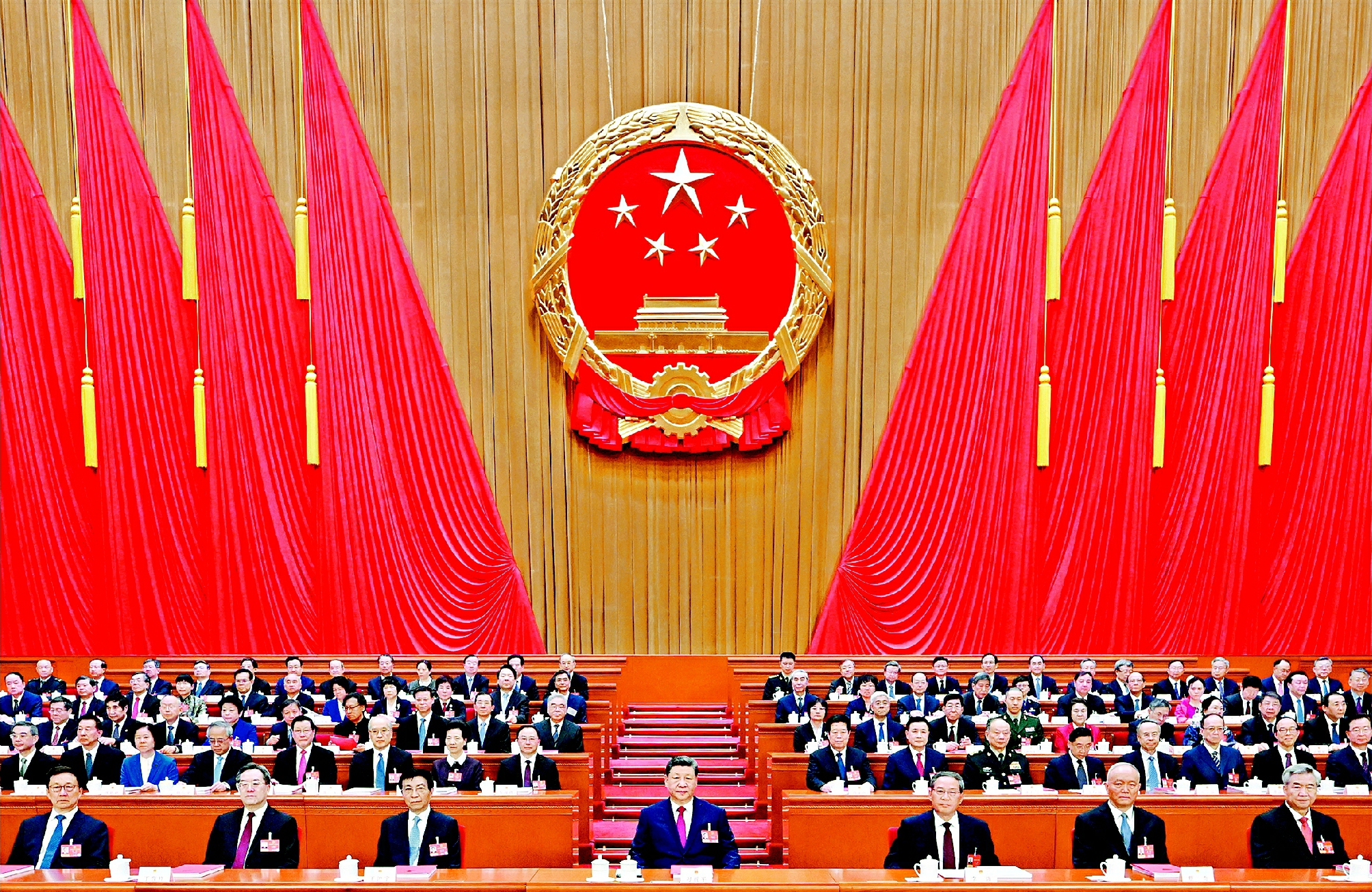 3月12日下午,第十四届全国人民代表大会第四次会议在北京人民大会堂闭幕。党和国家领导人习近平、李强、王沪宁、蔡奇、丁薛祥、李希、韩正等在主席台就座。 新华社记者谢环驰摄