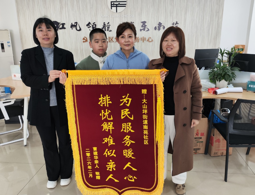 3月9日,一面写着“为民服务暖人心,排忧解难似亲人”的锦旗,送到泸州市江阳区大山坪街道南苑社区办公室。送锦旗的是社区独居老人曹建华的侄女,她紧握着社区居委会副主任徐英的手说:“这几年多亏了你们,我大伯才能得到妥善的照顾,我们终于得以团聚!”