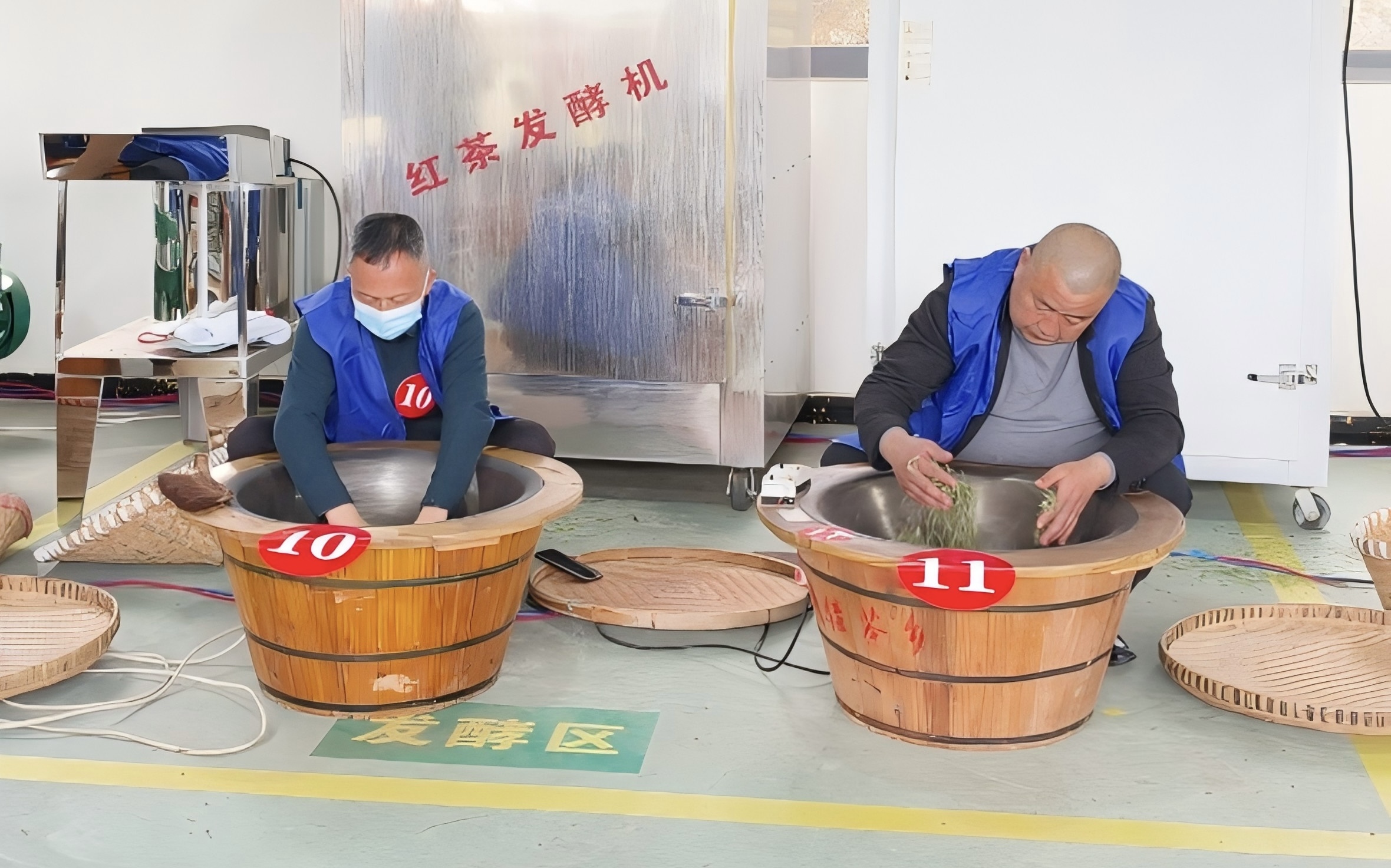采茶结束,制茶区接着开赛。26名炒茶师傅各就各位,电炒锅一字排开,每人面前0.6公斤鲜芽。吴林把手伸到锅口试了试温,“刺啦”一声,青叶落锅,他的手贴着滚烫的铁锅开始翻动。这位从业二十多年的老匠人,前年获得过比赛第一名,今年又来角逐桂冠。