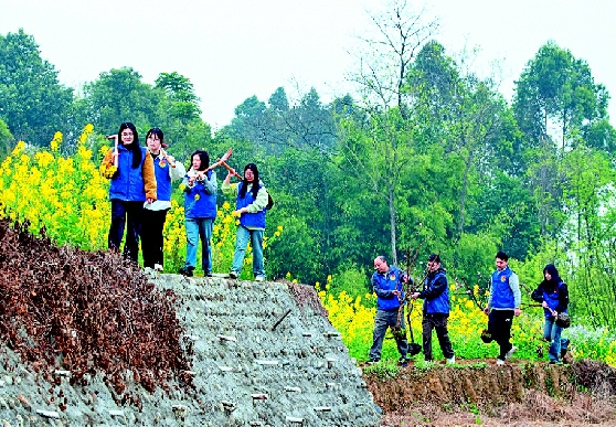 本报讯 (罗国杨文/图)3月12日,在成都市彭州葛仙山镇官仓村,共青团彭州市委的青年志愿者参加植树活动,为春天增绿添彩。