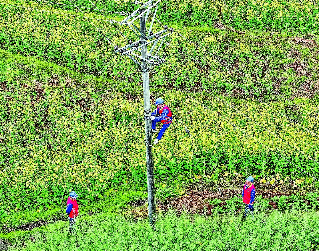 图为3月18日,党员服务队队员在该市永兴镇马架坪村检修供电线路,确保春耕生产用电。