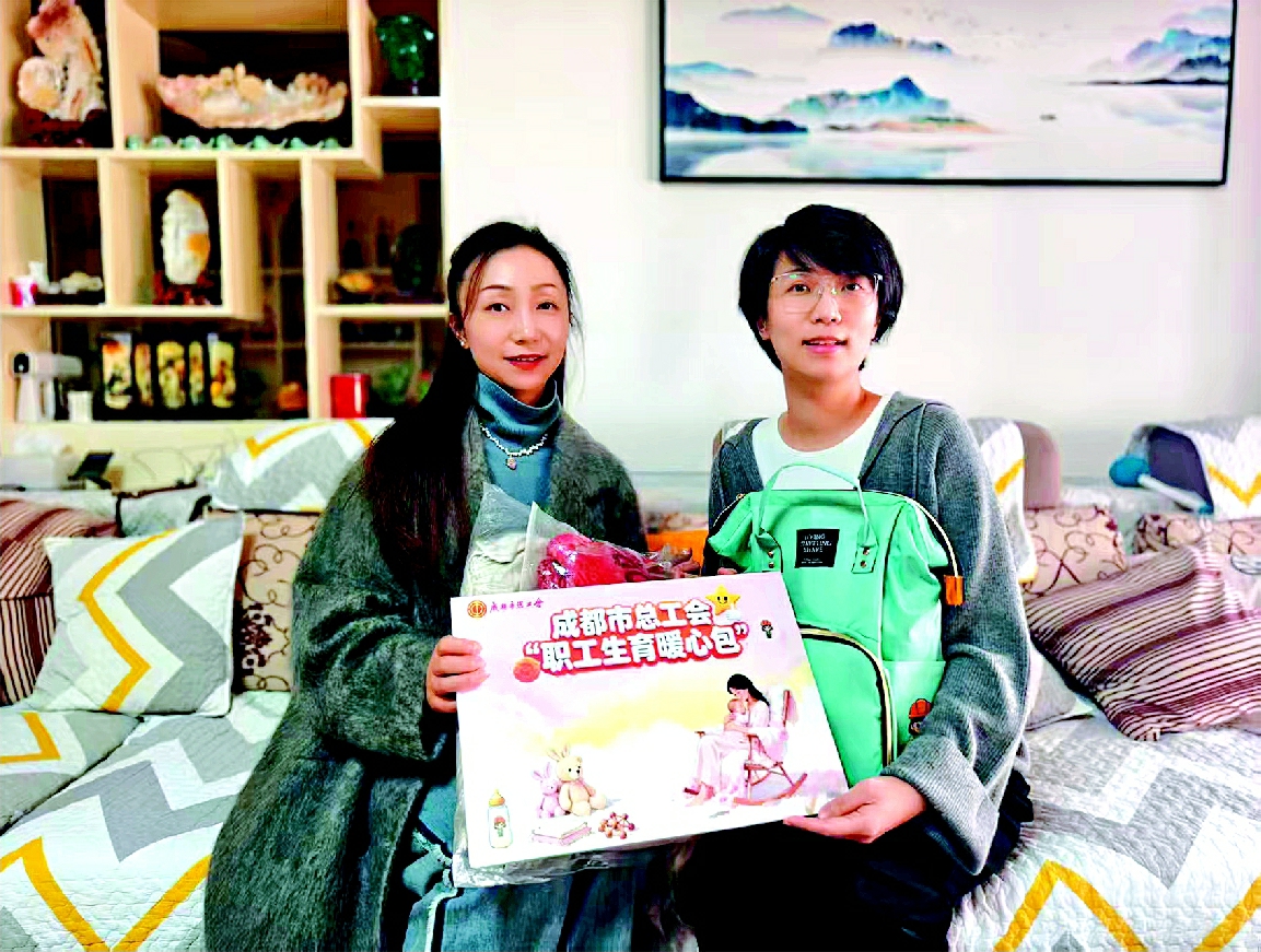 郑恒煊(右)收到工会的“生育暖心包”