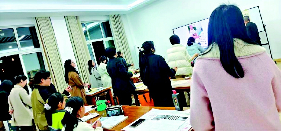 当晚6时30分许,学员们陆续来到岳池县职工活动中心书法培训课堂。“握笔要做到指实掌虚腕平,坐姿需头正肩平背直足安”,在书法教室里,老师一边示范标准姿势,一边拿出尺子等道具辅助讲解,用通俗易懂的语言拆解运笔技巧中的起、行、收要点。学员们时而低头揣摩笔画走势,时而举手向老师请教,现场学习氛围浓厚。