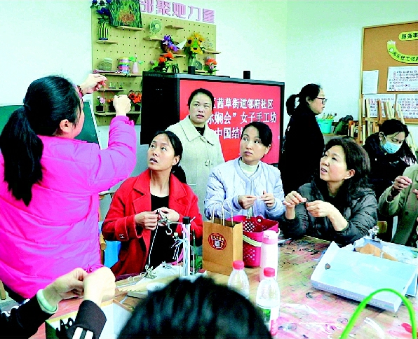 本报讯(袁玉华张耀仁文/图)3月18日,泸州市江阳区茜草街道邻府社区手工教室内,江阳区非遗袁氏绳结传统制作技艺第三代传承人袁雪梅,正手把手教社区的宝妈们编织市级非遗产品“中国结”。