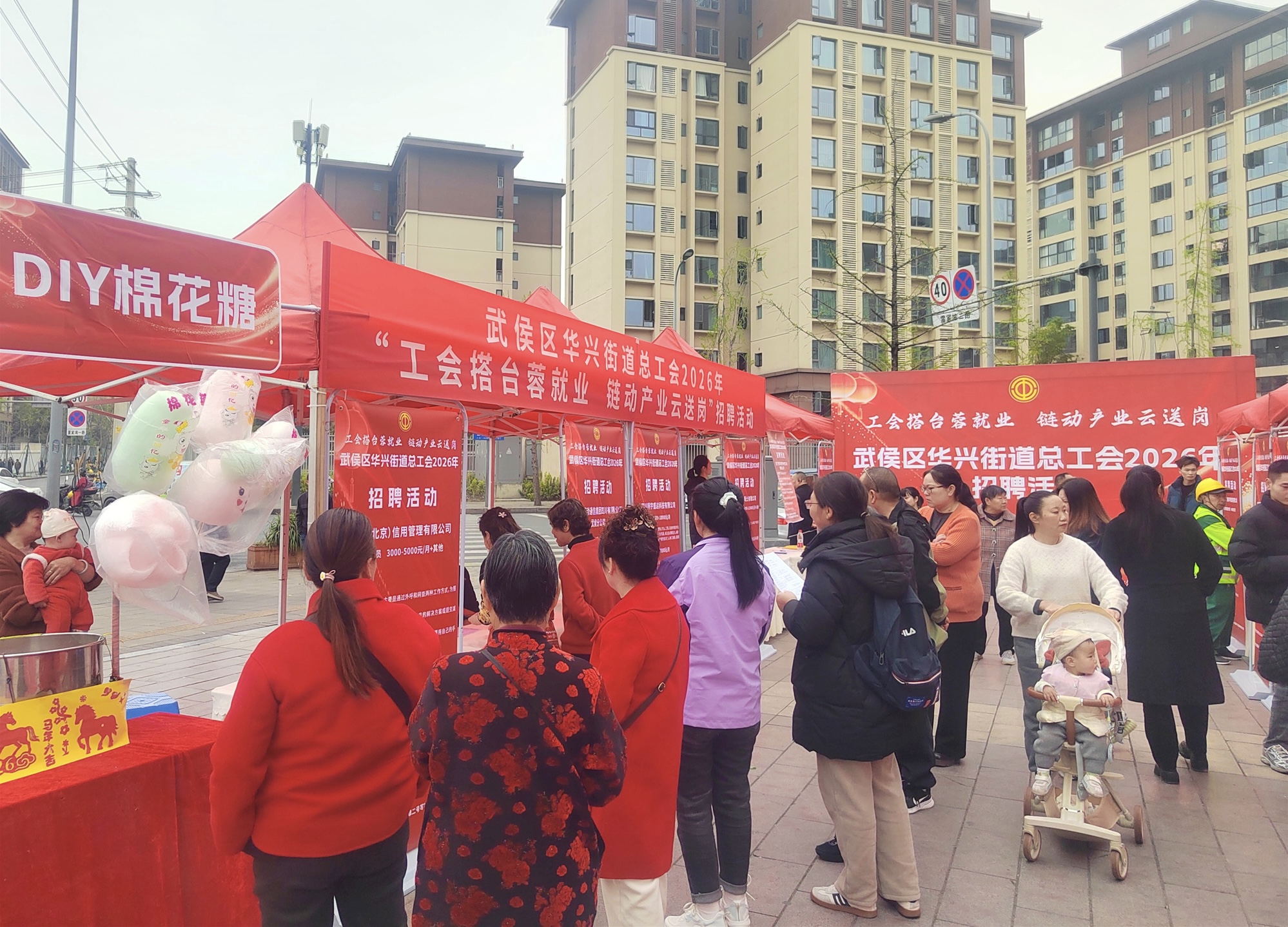 本报讯(记者张杨文/图)3月22日上午,由成都市武侯区华兴街道总工会主办的2026年“工会搭台蓉就业·链动产业云送岗”专场招聘活动,在武侯区水岸花园广场火热开启。活动创新采用“现场招聘+政策宣讲+文化体验”的复合模式,为辖区企业与求职者搭建起一座有温度、有深度的“就业立交桥”。