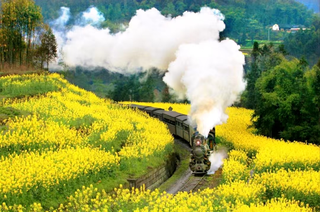 3月的川南,油菜花在山谷间铺展成金色的海洋。一列冒着白烟的蒸汽小火车从花海深处缓缓驶来,汽笛声撞碎晨雾,惊起林间山雀。这悠长的鸣笛声,如同一把穿越时光的利刃,划破山谷的寂静,已在这片土地上回响了67年,诉说着嘉阳煤矿从烽火硝烟到时代转型的壮阔历程。