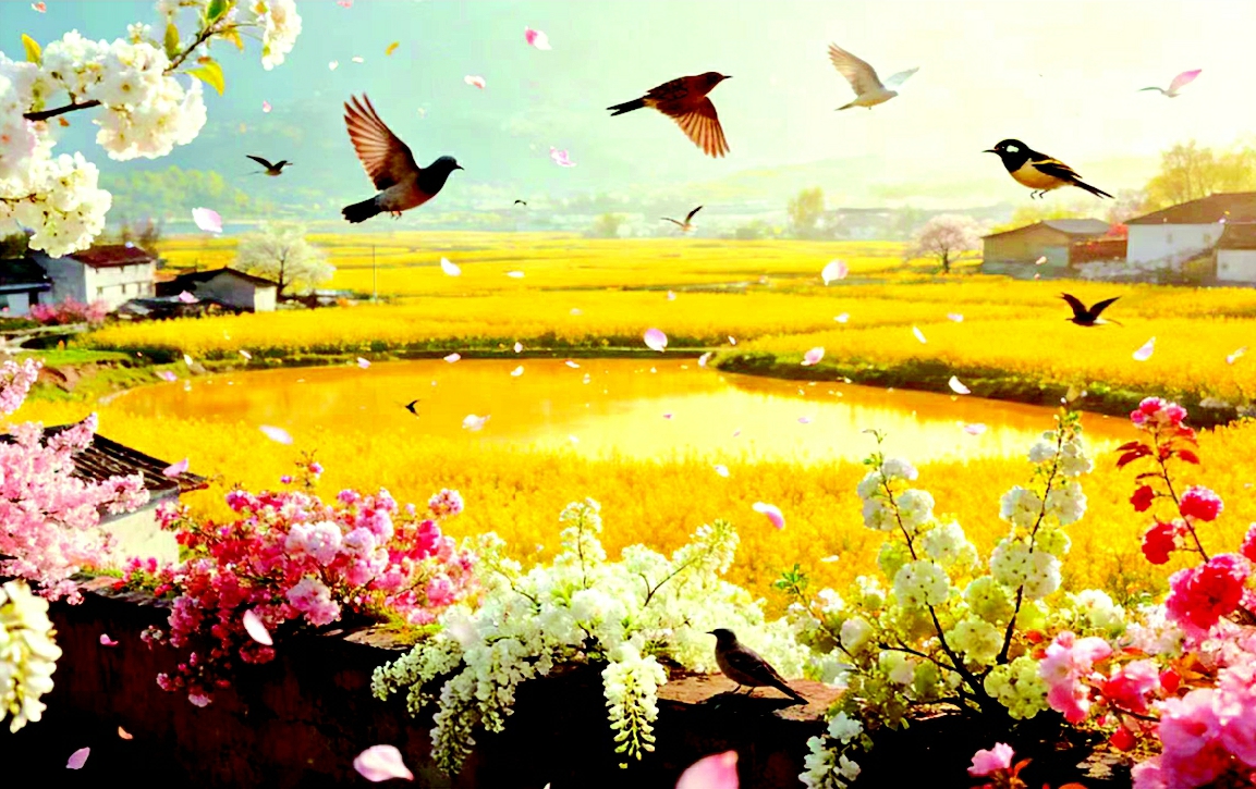 平坦如砥的田野,绚烂的油菜花淌成盈盈汪汪的金色池塘;农家院舍墙头,一丛丛樱花、杏花、梨花、桃花、李花、槐花,蕴成缤纷的云朵,随风轻摇慢曳;斑鸠、布谷、白头翁、点水雀、胡豆雀、小麻雀的啁啾,长一声短一声,此起彼伏。这一切,当然也让我们心生欢喜,但那股子新鲜劲儿转眼就消淡了。川西平原美好春光如诗如画,我们就生活在其中,天天耳濡目染,本身也成了这诗画里的一个标点、一滴墨迹、一团小小风景。对家乡时令风情的美好,我们理所当然习以为常,并早已熟稔于心。