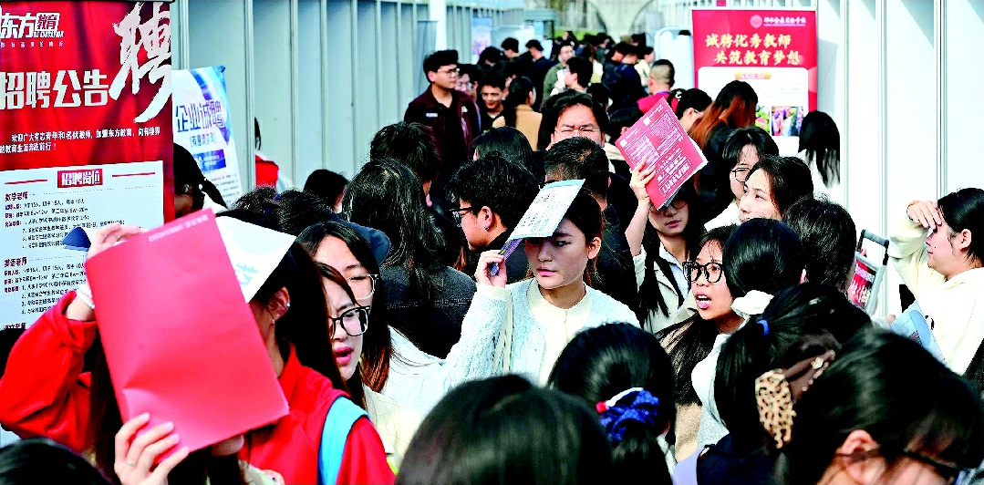 4月2日,在内江师范学院2026届毕业生春季双选会现场,应届毕业生正同用人单位工作人员面对面交流。
