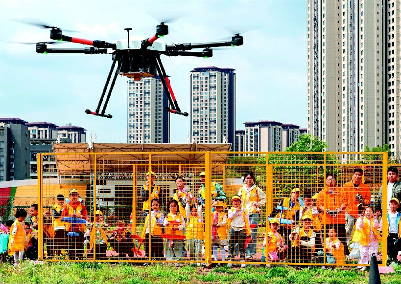 在为期2天的托管研学活动中,孩子们身着统一的马甲,在学校学生志愿者全程陪同照料下,有序开启趣味十足的低空航空探索之旅。