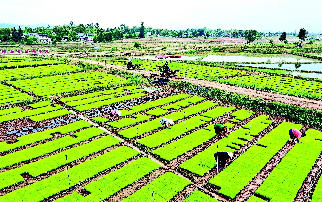 春风拂沃野,春耕正当时。连日来,气温回升、晴好天气持续,广安市广安区花桥镇抢抓春耕生产黄金期,有序推进水稻机械化插秧作业,一排排秧苗整齐摆放在秧盘里,一台台插秧机在田间穿梭忙碌,绘就一幅“春播希望”的田园画卷。图为4月10日,村民在翻运机插秧秧苗。 廖小兵杨煜恒胡雪梅摄